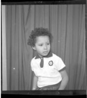 223. EAP449/2/33/223 Reference (shelfmark): EAP449/2/33/223 Title: A little boy with a light complexion wearing a white t-shirt with curly hair sitting face forward in the studio. Collection Area: Endangered Archives Programme Languages: Not applicable Date Range: 2nd half od the 20th century Extent: 1 TIFF image