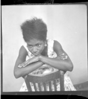 230. EAP449/2/33/230 Reference (shelfmark): EAP449/2/33/230 Title: A young girl wearing a white and black dress, earrings, an up-do, sitting and smiling with her arms on her chair in the studio. Collection Area: Endangered Archives Programme Languages: Not applicable Date Range: 2nd half od the 20th century Extent: 1 TIFF image