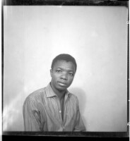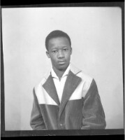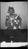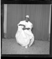 A woman sitting on a stool with her legs on a rug, wearing an up-do (touroukalla), a boubou, and a headscarf with legs and arms crossed facing forward in the studio.