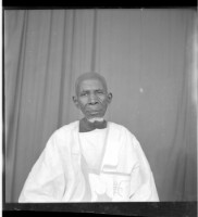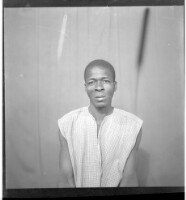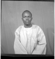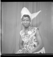 A couple facing forward in the studio, a woman sitting, wearing a une camisole, earrings, and a headscarf with a man sitting, wearing a white dress shirt and suit.