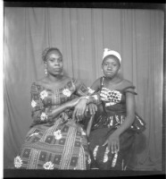 Two women facing forward in the studio. The woman on the left wearing a une camisole, black pagne, earrings, and headscarf with a watch on her arms which are crossed. The woman on the right wearing a black dress and earrings.