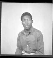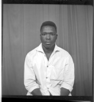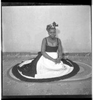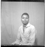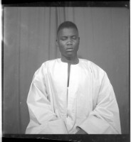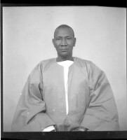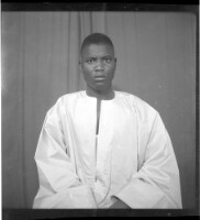 Two men sitting facing forward in the studio, one man wearing a white boubou with a hat in his hands, the other man wearing a black suit with a pen in the pocket.