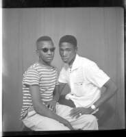 376. EAP449/2/33/376 Reference (shelfmark): EAP449/2/33/376 Title: Two young men sitting facing forward in the studio, one wearing a white and black t-shirt and glasses, and the other wearing a white short sleeved shirt and a watch. Collection Area: Endangered Archives Programme Languages: Not applicable Date Range: 2nd half od the 20th century Extent: 1 TIFF image