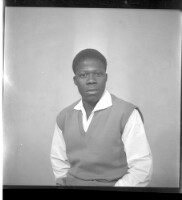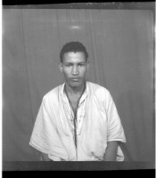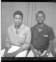 Two young men sitting facing forward in the studio, one wearing a long sleeved dress shirt and white pants and the other wearing a black dress shirt and watch.