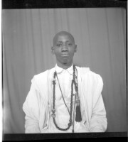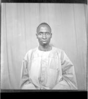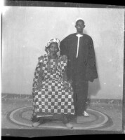 Full shot of a couple standing on a rug in the studio, a woman sitting on a stool wearing a cotton boubou, headscarf, and earrings with a man standing with his right arm on the woman, wearing a black boubou and white Fez.