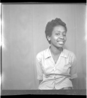 A young girl sitting facing forward in the studio wearing a long sleeved dress shirt, a cross necklace, and large hair, smiling with her left eye closed.