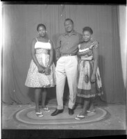 Full shot of three people standing, on the left a young girl wearing a dress, a hairdo, white earrings, a purse, and a watch, in the middle a man wearing a long sleeved black dress shirt, white pants, black shoes, and his left hand in his pocket, on the r