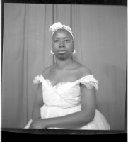 Three little girls on a rug in the studio, on the left a little girl standing wearing a dress and shoes, in the middle the tallest girl sitting on a stool wearing a dress, and a third little girl on the left standing wearing a une camisole and trousers.