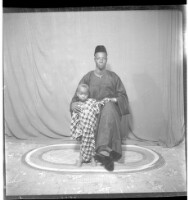 Full shot of an old man sitting on a rug facing forward in the studio, wearing a black boubou, a watch, a black Fez, with his legs crossed and black shoes. He is holding a little boy standing next to him wearing a boubou.