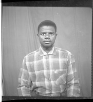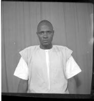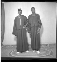 Two men standing on a rug facing forward in the studio, one man wearing a black boubou, a watch, a black Fez, white shoes, and the other man wearing a black boubou, a watch, glasses, and white shoes.