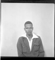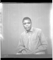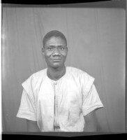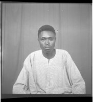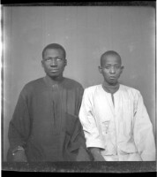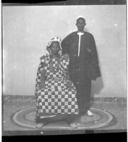 A couple on a rug in the studio, the woman sitting in a chair wearing a cotton boubou, a necklace, and a headscarf with a man standing next to her wearing a black boubou and a white Fez.
