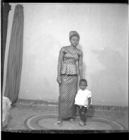 A woman standing on a rug in the studio wearing a une camisole, a pagne, and earrings smiling holding a little girl standing next to her wearing a white dress, diaper, and shoes.