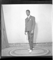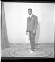 483. EAP449/2/33/483 Reference (shelfmark): EAP449/2/33/483 Title: A man standing on a rug in the studio wearing a white dress shirt, black suit, and white shoes. Collection Area: Endangered Archives Programme Languages: Not applicable Date Range: 2nd half od the 20th century Extent: 1 TIFF image