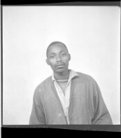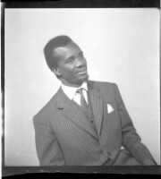 484. EAP449/2/33/484 Reference (shelfmark): EAP449/2/33/484 Title: A man sitting facing forward in the studio wearing a black t-shirt and a black boubou. Collection Area: Endangered Archives Programme Languages: Not applicable Date Range: 2nd half od the 20th century Extent: 1 TIFF image