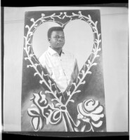 42. EAP449/2/33/42 Reference (shelfmark): EAP449/2/33/42 Title: A man wearing a shirt standing face-forward behind a card in the shape of a heart covered in flowers in the studio Collection Area: Endangered Archives Programme Languages: Not applicable Date Range: 2nd half od the 20th century Extent: 1 TIFF image
