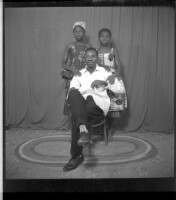 49. EAP449/2/33/49 Reference (shelfmark): EAP449/2/33/49 Title: Three people, two girls wearing dresses standing face-forward behind a man wearing a shirt and pants sitting in a chair facing forward in the studio Collection Area: Endangered Archives Programme Languages: Not applicable Date Range: 2nd half od the 20th century Extent: 1 TIFF image