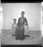 68. EAP449/2/33/68 Reference (shelfmark): EAP449/2/33/68 Title: A man wearing a black boubou and a hat sitting face-forward and two children standing facing forward on either side of him. Collection Area: Endangered Archives Programme Languages: Not applicable Date Range: 2nd half od the 20th century Extent: 1 TIFF image