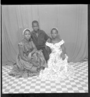 207. EAP449/2/7/207 Reference (shelfmark): EAP449/2/7/207 Title: Three people in the studio; two young women in dresses crouching and a young man in all-black crouching between them Collection Area: Endangered Archives Programme Languages: Not applicable Date Range: 2nd half od the 20th century Extent: 1 TIFF image