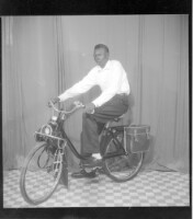 216. EAP449/2/7/216 Reference (shelfmark): EAP449/2/7/216 Title: A man sitting on a bicycle with a motor in the studio and wearing a white shirt and black pants Collection Area: Endangered Archives Programme Languages: Not applicable Date Range: 2nd half od the 20th century Extent: 1 TIFF image