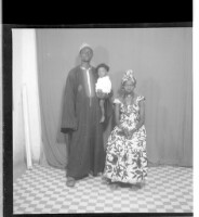 124. EAP449/2/8/124 Reference (shelfmark): EAP449/2/8/124 Title: A man wearing a large boubou with a baby standing face-forward and a woman wearing a dress sitting face-forward in the studio. Collection Area: Endangered Archives Programme Languages: Not applicable Date Range: 2nd half od the 20th century Extent: 1 TIFF image