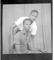 204. EAP449/2/8/204 Reference (shelfmark): EAP449/2/8/204 Title: Two men wearing t-shirts, one standing in profile and the other sitting in profile in the studio. Collection Area: Endangered Archives Programme Languages: Not applicable Date Range: 2nd half od the 20th century Extent: 1 TIFF image