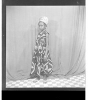 246. EAP449/2/8/246 Reference (shelfmark): EAP449/2/8/246 Title: A girl wearing a dress and head wrap standing in profile in the studio. Collection Area: Endangered Archives Programme Languages: Not applicable Date Range: 2nd half od the 20th century Extent: 1 TIFF image