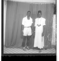 250. EAP449/2/8/250 Reference (shelfmark): EAP449/2/8/250 Title: Two men, one wearing shorts and the other wearing a boubou with an amulet, both stand face-forward in the studio. Collection Area: Endangered Archives Programme Languages: Not applicable Date Range: 2nd half od the 20th century Extent: 1 TIFF image