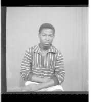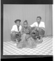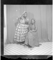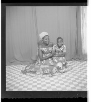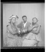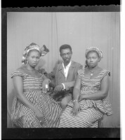 Three people: two women wearing dresses and head wraps sitting in profile in front, and a man wearing a jacket sitting face-forward behind in the studio.