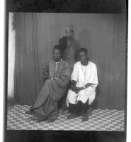 293. EAP449/2/8/293 Reference (shelfmark): EAP449/2/8/293 Title: Three men wearing boubous, two sitting in profile in front and one standing in profile behind in the studio. Collection Area: Endangered Archives Programme Languages: Not applicable Date Range: 2nd half od the 20th century Extent: 1 TIFF image