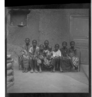 323. EAP449/2/8/323 Reference (shelfmark): EAP449/2/8/323 Title: Eleven people of whom ten are sitting, among them four girls, a boy, and three men facing forward and a baby in profile, and one man standing face-forward in front of a doorway. Collection Area: Endangered Archives Programme Languages: Not applicable Date Range: 2nd half od the 20th century Extent: 1 TIFF image