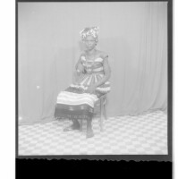348. EAP449/2/8/348 Reference (shelfmark): EAP449/2/8/348 Title: A woman wearing a dress and pagne wears a head wrap sitting in profile in the studio. Collection Area: Endangered Archives Programme Languages: Not applicable Date Range: 2nd half od the 20th century Extent: 1 TIFF image