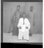 46. EAP449/2/8/46 Reference (shelfmark): EAP449/2/8/46 Title: Three men wearing boubous; two standing behind and one sitting in front, all face-forward in the studio. Collection Area: Endangered Archives Programme Languages: Not applicable Date Range: 2nd half od the 20th century Extent: 1 TIFF image