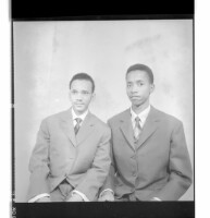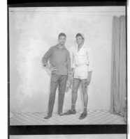505. EAP449/2/8/505 Reference (shelfmark): EAP449/2/8/505 Title: Two men standing, one face-forward wearing a t-shirt and the other in profile wearing a shirt and shorts in the studio. Collection Area: Endangered Archives Programme Languages: Not applicable Date Range: 2nd half od the 20th century Extent: 1 TIFF image