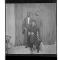 501. EAP449/2/8/501 Reference (shelfmark): EAP449/2/8/501 Title: Three men, one wearing a suit and one wearing a shirt standing face-forward and the other wearing a shirt and shorts sitting in profile in front in the studio. Collection Area: Endangered Archives Programme Languages: Not applicable Date Range: 2nd half od the 20th century Extent: 1 TIFF image