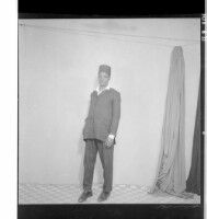 533. EAP449/2/8/533 Reference (shelfmark): EAP449/2/8/533 Title: A man wearing a suit and hat standing in profile in the studio. Collection Area: Endangered Archives Programme Languages: Not applicable Date Range: 2nd half od the 20th century Extent: 1 TIFF image