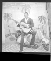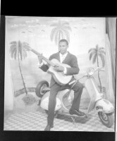 107. EAP449/2/9/107 Reference (shelfmark): EAP449/2/9/107 Title: A man wearing a suit sitting in profile on a motorbike with a guitar in the studio. Collection Area: Endangered Archives Programme Languages: Not applicable Date Range: 2nd half od the 20th century Extent: 1 TIFF image