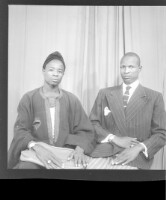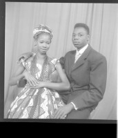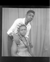 116. EAP449/2/9/116 Reference (shelfmark): EAP449/2/9/116 Title: A man wearing a shirt standing in profile and a woman wearing a pagne sitting in profile in the studio. Collection Area: Endangered Archives Programme Languages: Not applicable Date Range: 2nd half od the 20th century Extent: 1 TIFF image