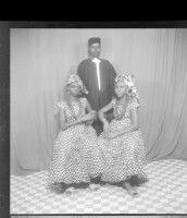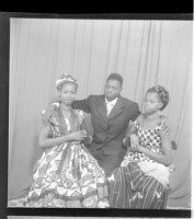 113. EAP449/2/9/113 Reference (shelfmark): EAP449/2/9/113 Title: Three people, one man wearing a boubou standing face-forward and two women wearing dresses sitting face-forward in the studio. Collection Area: Endangered Archives Programme Languages: Not applicable Date Range: 2nd half od the 20th century Extent: 1 TIFF image