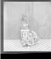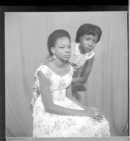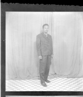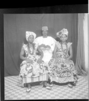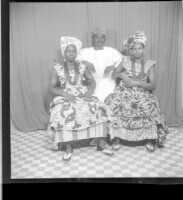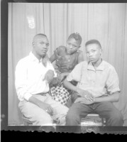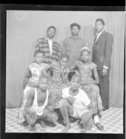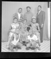 Eight people; three men, one in a suit standing in profile, two in shirts standing face-forward, three women in dresses sitting face-forward, and two boys sitting face-forward in front in the studio.
