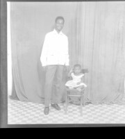 215. EAP449/2/9/215 Reference (shelfmark): EAP449/2/9/215 Title: A man wearing a shirt standing face-forward and a baby sitting face-forward on a chair in the studio. Collection Area: Endangered Archives Programme Languages: Not applicable Date Range: 2nd half od the 20th century Extent: 1 TIFF image