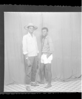 275. EAP449/2/9/275 Reference (shelfmark): EAP449/2/9/275 Title: Two men wearing shirts, one in shorts and the other wearing pants and a hat, standing in profile in the studio. Collection Area: Endangered Archives Programme Languages: Not applicable Date Range: 2nd half od the 20th century Extent: 1 TIFF image