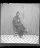291. EAP449/2/9/291 Reference (shelfmark): EAP449/2/9/291 Title: A man wearing a boubou sitting in profile with legs crossed in the studio. Collection Area: Endangered Archives Programme Languages: Not applicable Date Range: 2nd half od the 20th century Extent: 1 TIFF image