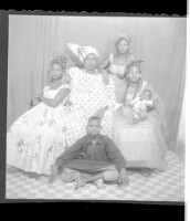 298. EAP449/2/9/298 Reference (shelfmark): EAP449/2/9/298 Title: Four women wearing large pagnes, one with a baby, sitting face-forward and a man wearing a boubou sitting in profile in front in the studio. Collection Area: Endangered Archives Programme Languages: Not applicable Date Range: 2nd half od the 20th century Extent: 1 TIFF image
