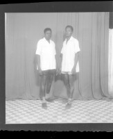 314. EAP449/2/9/314 Reference (shelfmark): EAP449/2/9/314 Title: Two men wearing shirts and shorts standing in profile in the studio. Collection Area: Endangered Archives Programme Languages: Not applicable Date Range: 2nd half od the 20th century Extent: 1 TIFF image