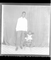 327. EAP449/2/9/327 Reference (shelfmark): EAP449/2/9/327 Title: A man wearing a shirt standing face-forward and a baby sitting face-forward in a chair in the studio. Collection Area: Endangered Archives Programme Languages: Not applicable Date Range: 2nd half od the 20th century Extent: 1 TIFF image