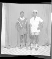 328. EAP449/2/9/328 Reference (shelfmark): EAP449/2/9/328 Title: Two men wearing shorts, one with a military hat, standing face-forward in the studio. Collection Area: Endangered Archives Programme Languages: Not applicable Date Range: 2nd half od the 20th century Extent: 1 TIFF image