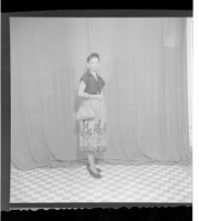 333. EAP449/2/9/333 Reference (shelfmark): EAP449/2/9/333 Title: A woman wearing a dress standing in profile with a hand bag in the studio. Collection Area: Endangered Archives Programme Languages: Not applicable Date Range: 2nd half od the 20th century Extent: 1 TIFF image
