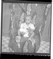 383. EAP449/2/9/383 Reference (shelfmark): EAP449/2/9/383 Title: A baby sitting on a sheet in a chair in the studio. Collection Area: Endangered Archives Programme Languages: Not applicable Date Range: 2nd half od the 20th century Extent: 1 TIFF image