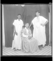 393. EAP449/2/9/393 Reference (shelfmark): EAP449/2/9/393 Title: Three men wearing boubous, two standing in profile and one sitting in profile in the studio. Collection Area: Endangered Archives Programme Languages: Not applicable Date Range: 2nd half od the 20th century Extent: 1 TIFF image