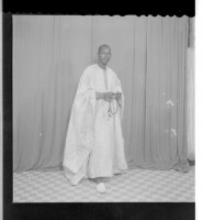 396. EAP449/2/9/396 Reference (shelfmark): EAP449/2/9/396 Title: A man wearing a large boubou standing in profile with a necklace in hand in the studio. Collection Area: Endangered Archives Programme Languages: Not applicable Date Range: 2nd half od the 20th century Extent: 1 TIFF image
